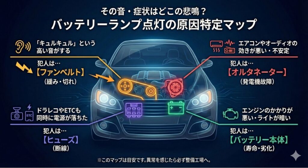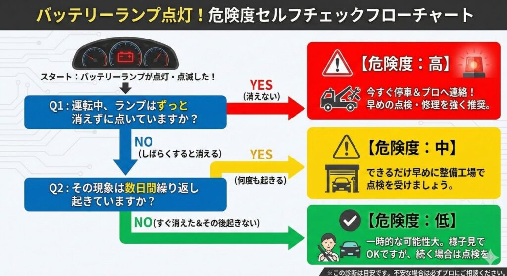 バッテリーランプの点灯はバッテリーだけでなく、関連機器の故障も疑われます。