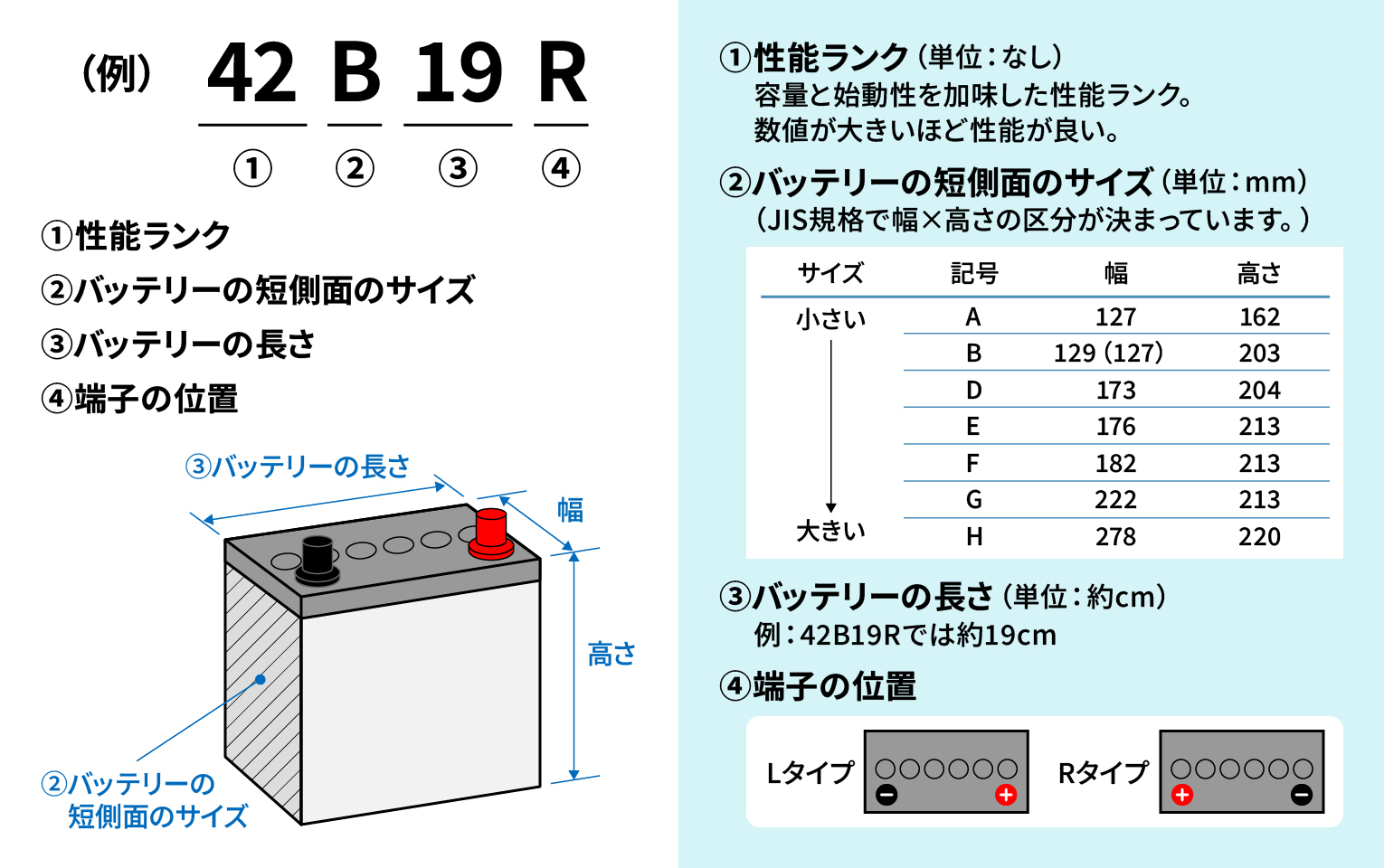 通常車だとバッテリーには「42B19R」などのように、数字とアルファベットを組み合わせた文字が書いてあります。