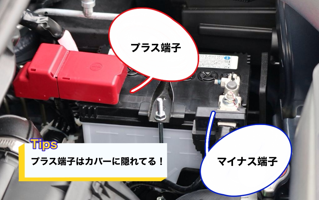この赤いカバー側が「プラス端子(カバー下にある)」、その反対側がマイナス端子です。