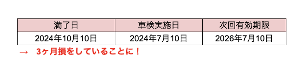 つまり、前回の車検で2024年10月10日までの費用を支払っていることを考慮すると、3ヶ月分損をする計算になるのです。