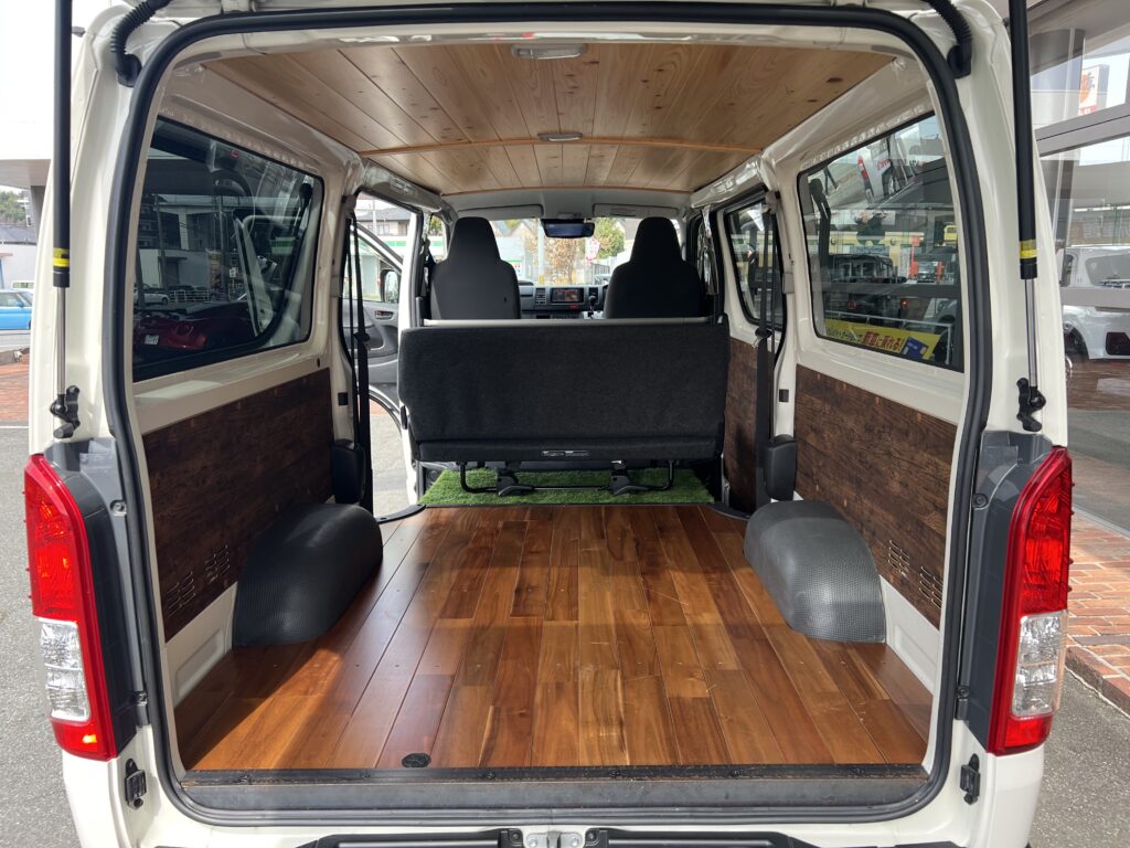 ハイエースの特徴である広い荷室をフラットにし、大胆な板張りにDIY。